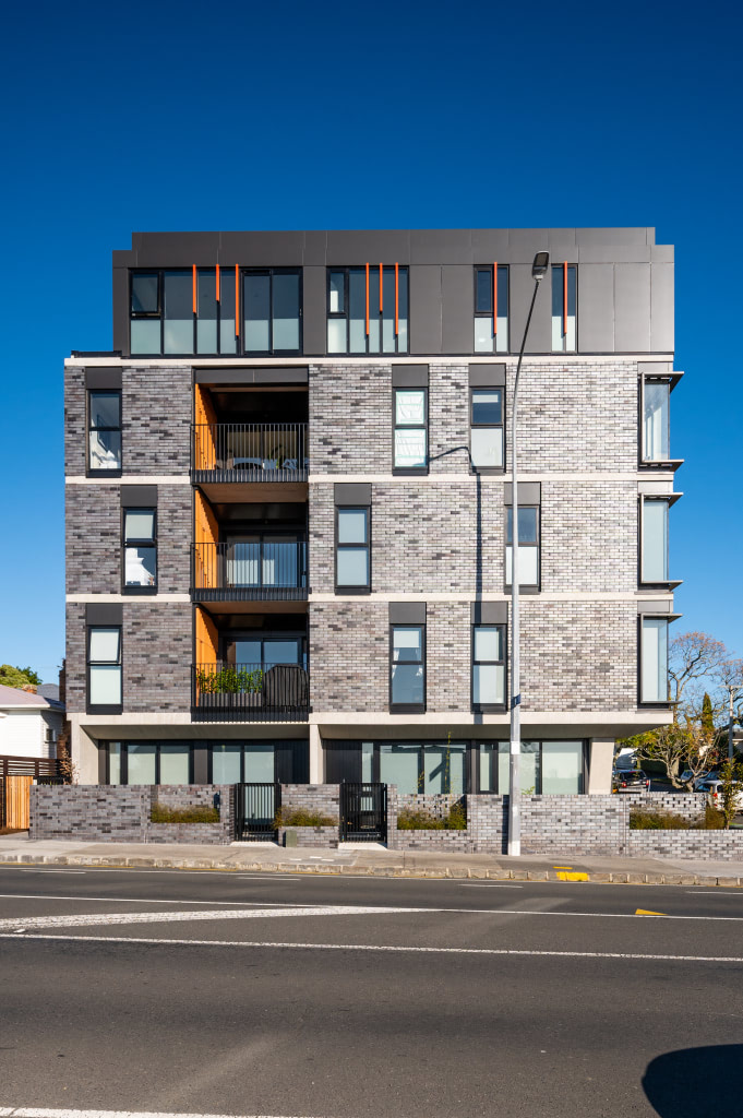 Located in Auckland’s Point Chevalier, the Point & Miller Apartments boast a façade clad with Paneltec’s Induracore G2 panels in Satin Black Metallic. The project was executed by NZ Force Construction as the builder, Paul Brown Architects as the architect, and ACMF as the installer.