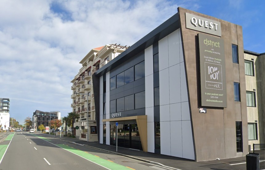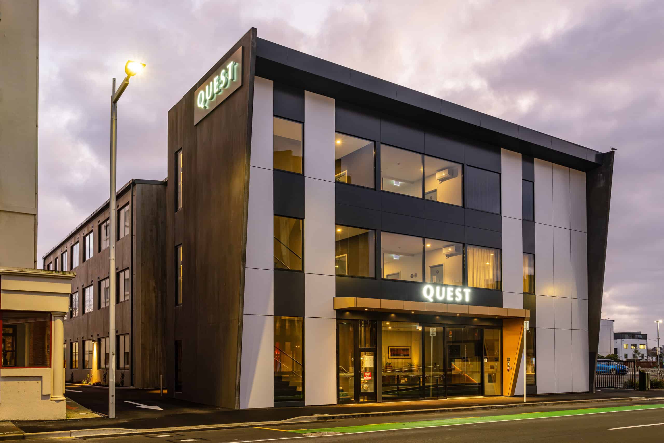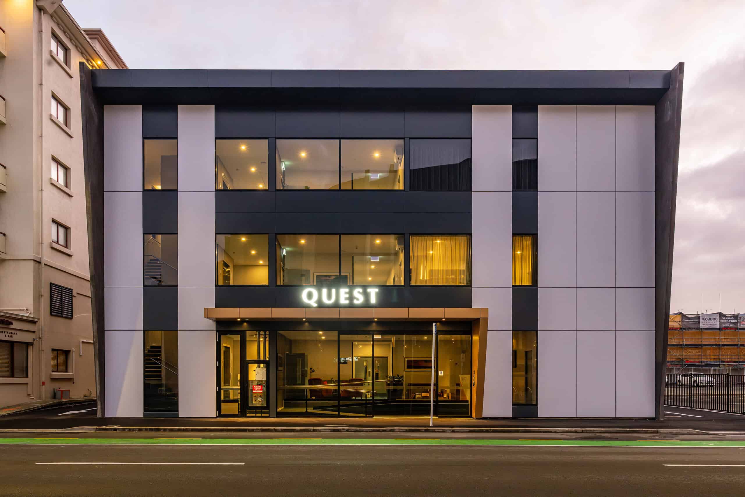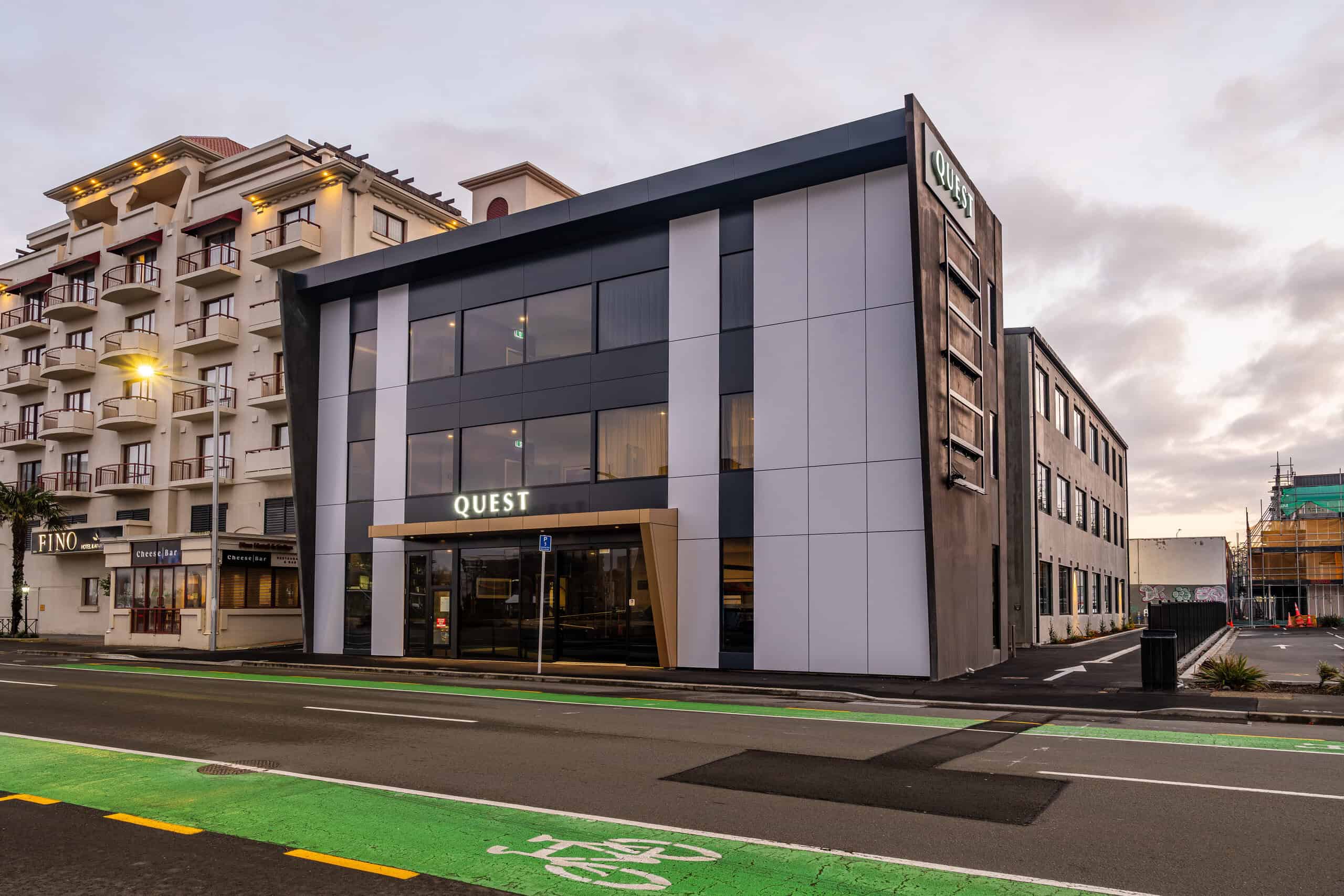The Quest hotel on Kilmore Street in Christchurch features a modern, attractive and low maintenance facade, to give an up-market face to this building. It was built by Myles Construction and the feature Induracore G2 panel was installed by Stratco.